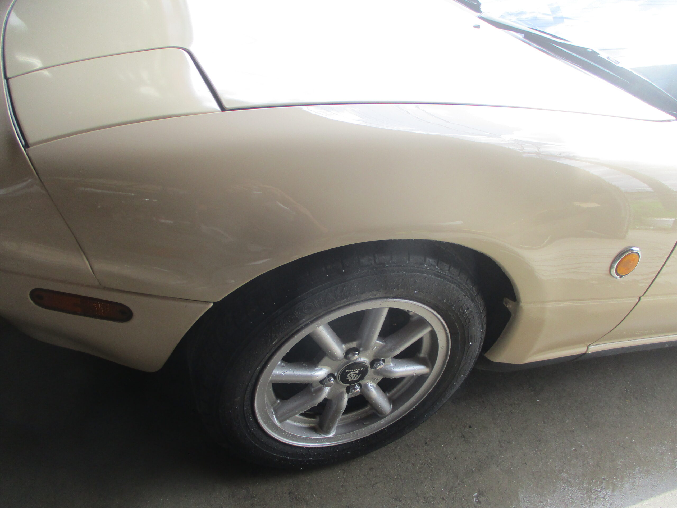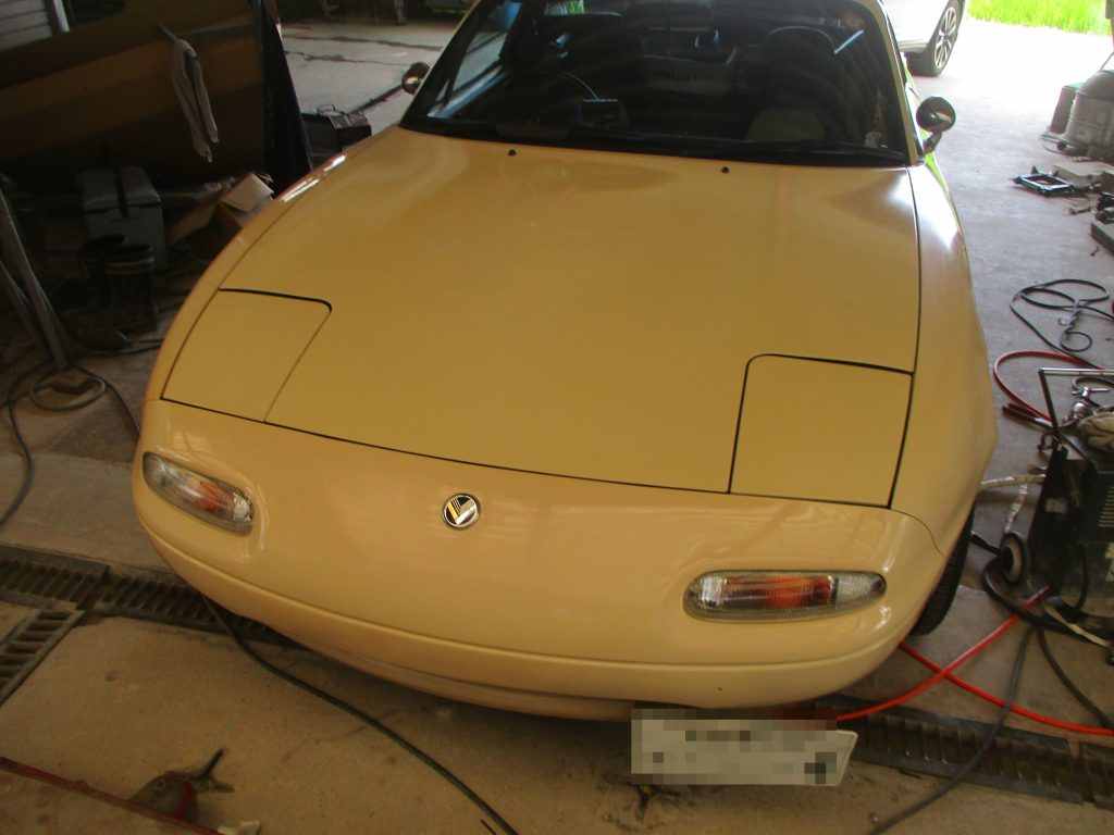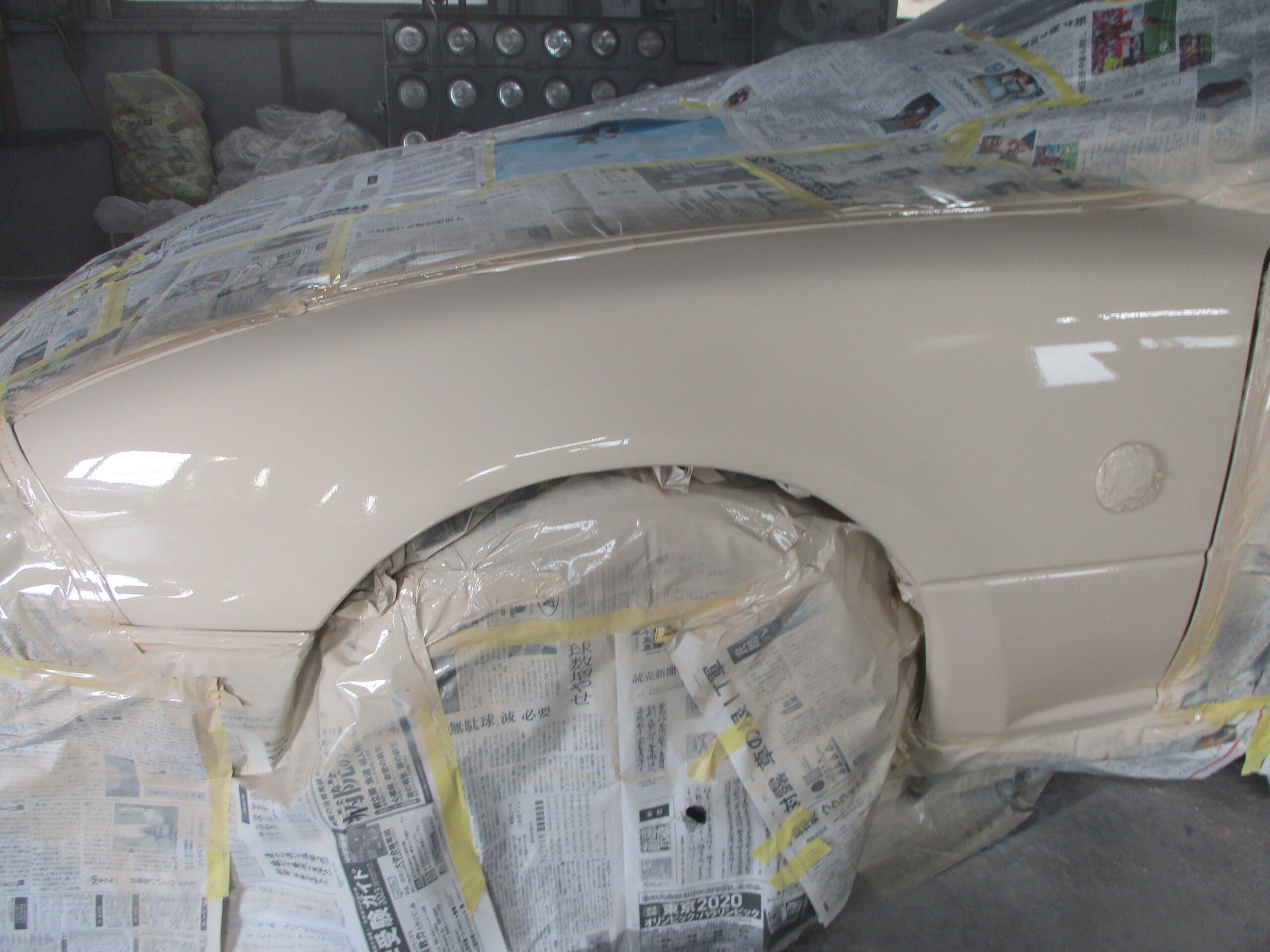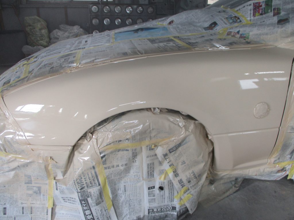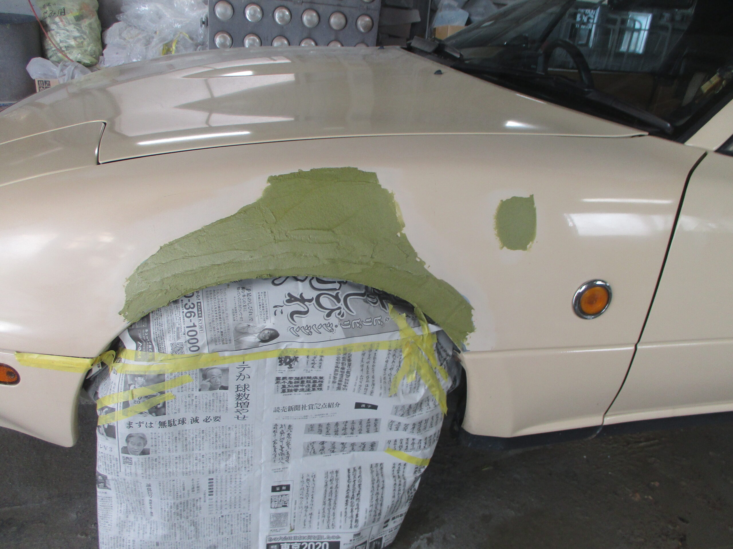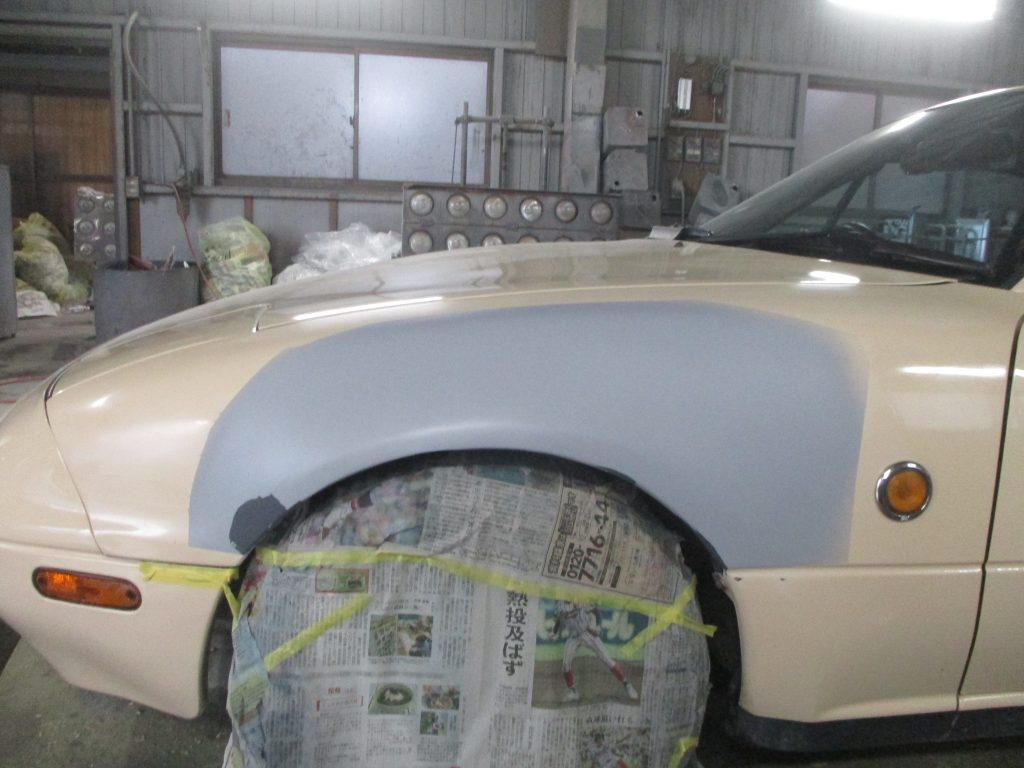 すみません、最初の画像を撮り忘れました。板金は凹んでる箇所を機械で引き出していき、形を作ります。まだ低い部分にパテを盛ったらサンダーで研いでラインを整えてます。徐々にパテを段階的に細かく変えます。