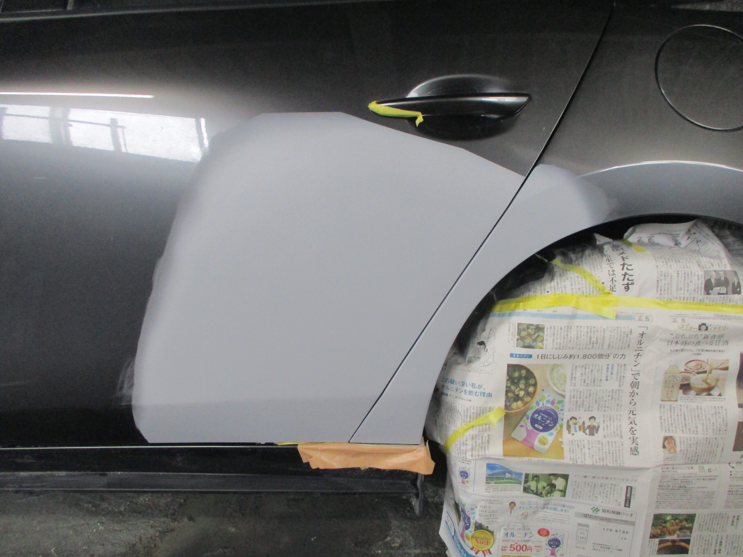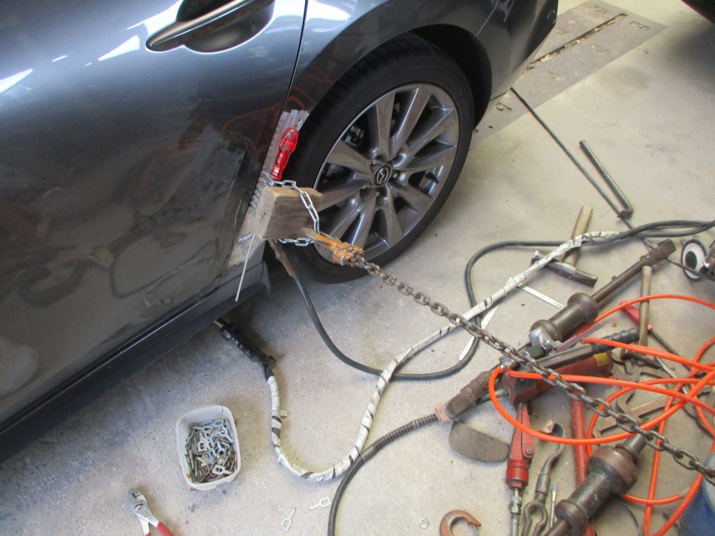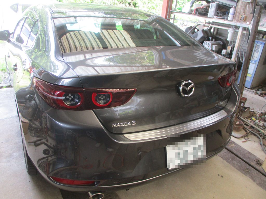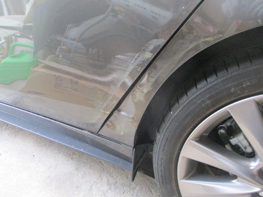 MAZDA3のリアドアとリアクォータとの境目で共に縦に20センチ近く凹んでいます。どちらも板金修理で綺麗に治します。