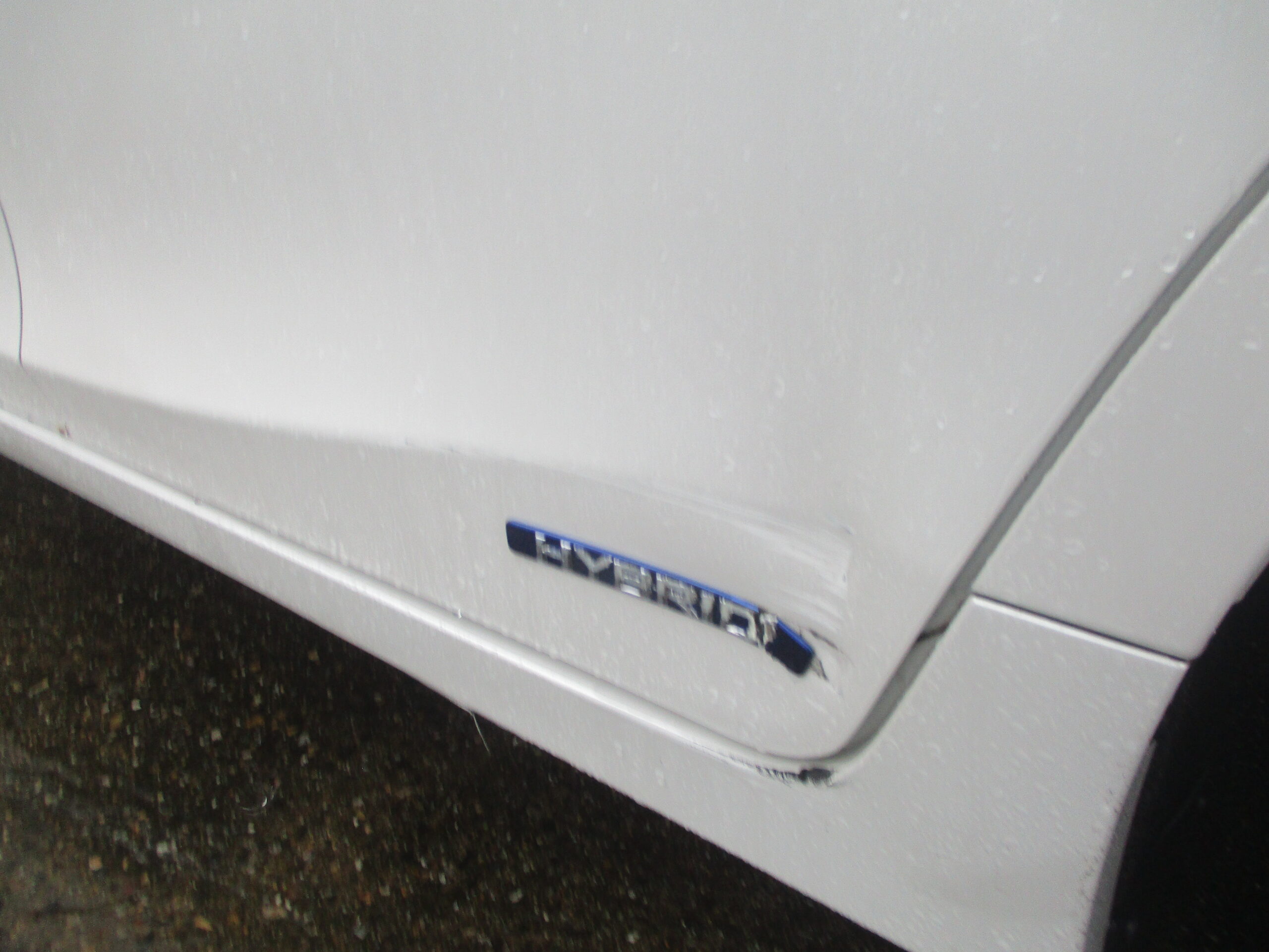 レクサスCTの左のリアドアの後ろ側のエンブレムマークが貼ってある部分で縦に凹んでいます。さらにすぐ下のサイドスポイラーにも傷があります。エンブレムも破損して割れているので新品に交換します。