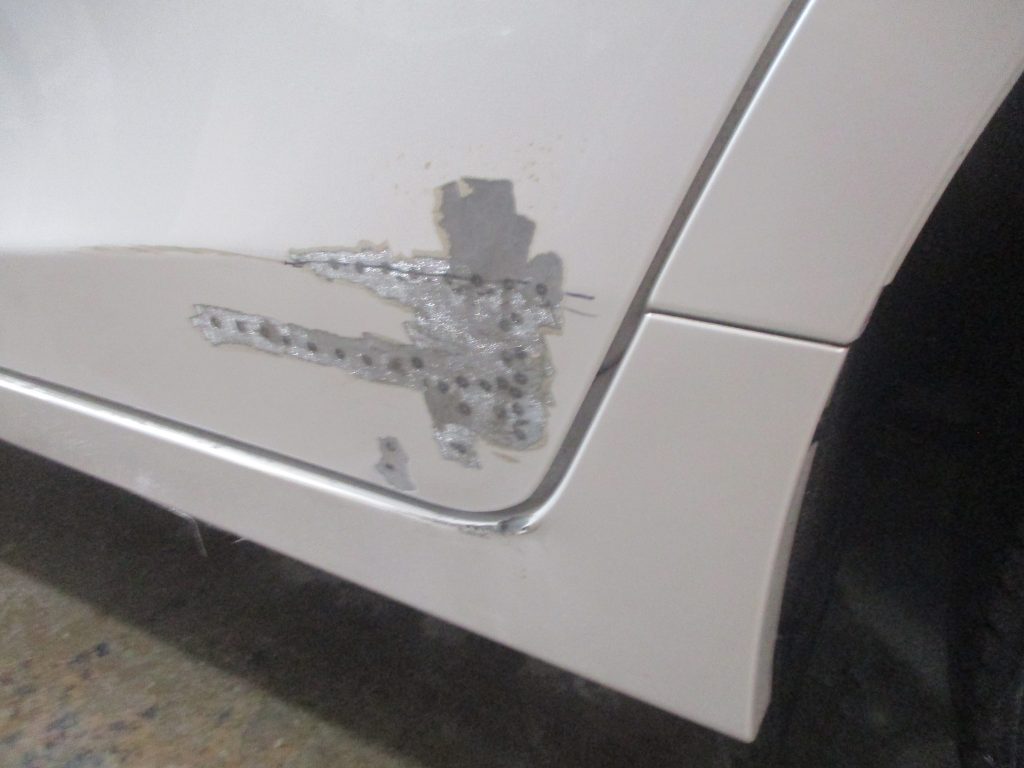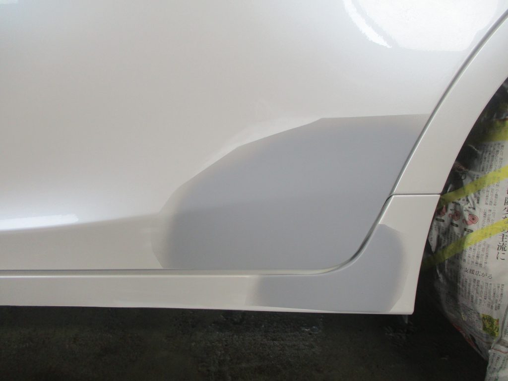 板金である程度の修理が出来たら、次はパテで凹んでる部分を埋めていきます。そして乾かしたら機械で研いでいき本来の形を作ります。その後サフェーサーを塗装してツルツルにして綺麗に仕上げます。サイドスポイラーも同様にサフェーサーを塗装して綺麗にします。