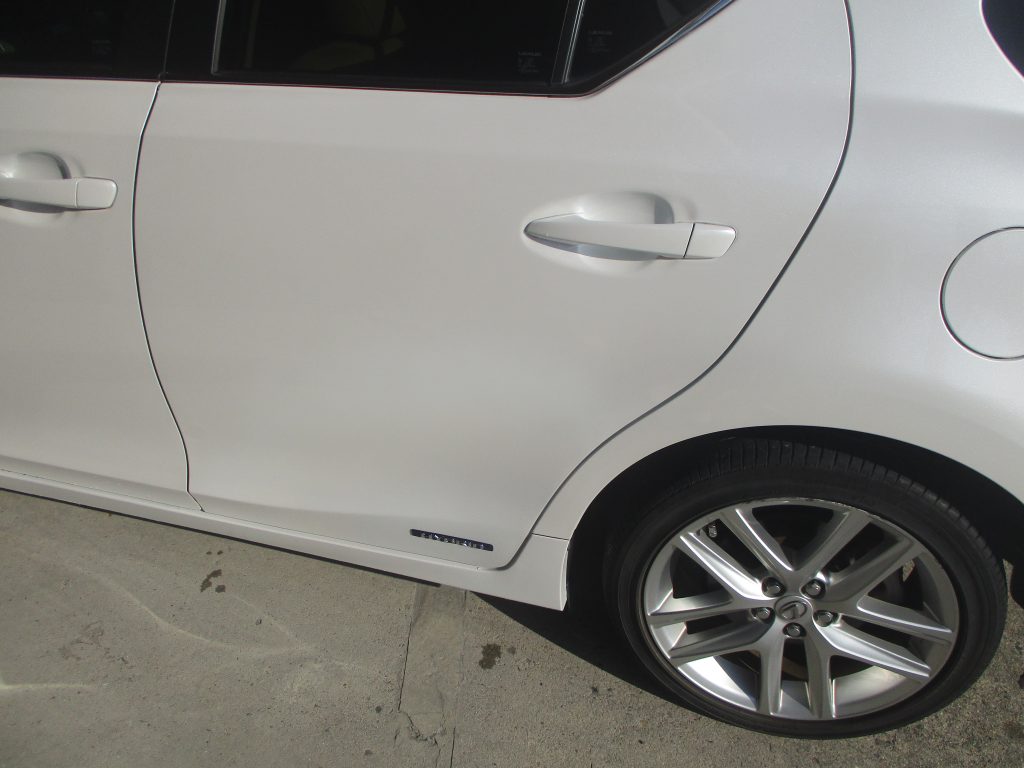 春日井市のお客様からレクサスCT200hの左リアドアと左サイドスポイラーのキズ・ヘコミの板金・塗装のご依頼をいただきました。
