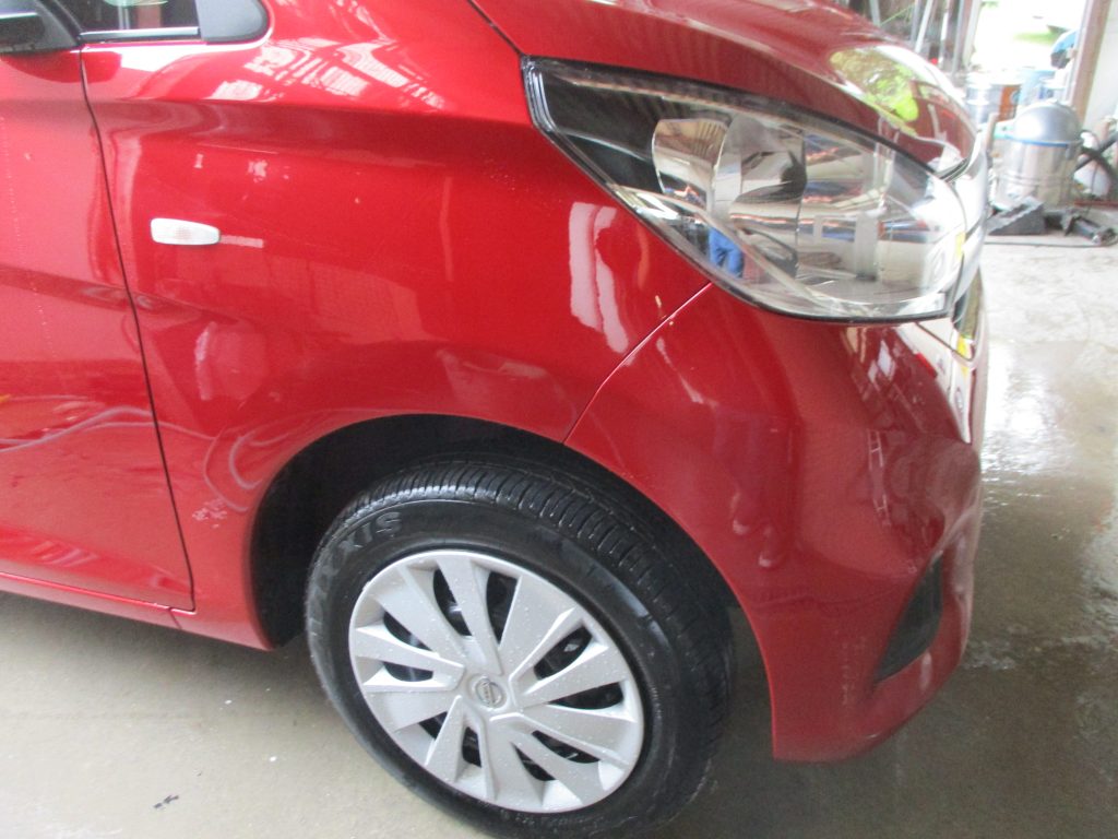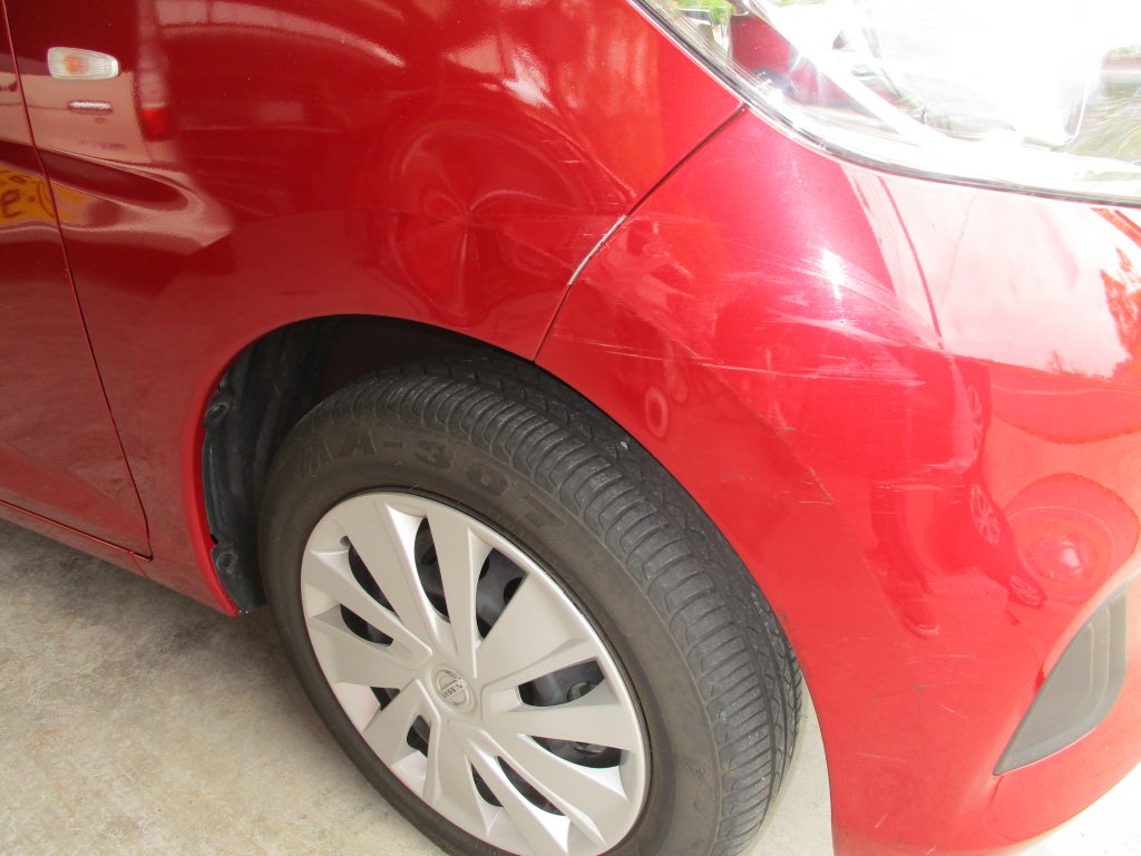 フロントバンパーの右側がフェンダーとの境目辺りから下の方まで擦り傷があります。フェンダーはフロントバンパー付近が幅15センチぐらいのヘコミがあります。境目のリテーナーも見えてます。フェンダーの内側の泥除けも少し変形してます。