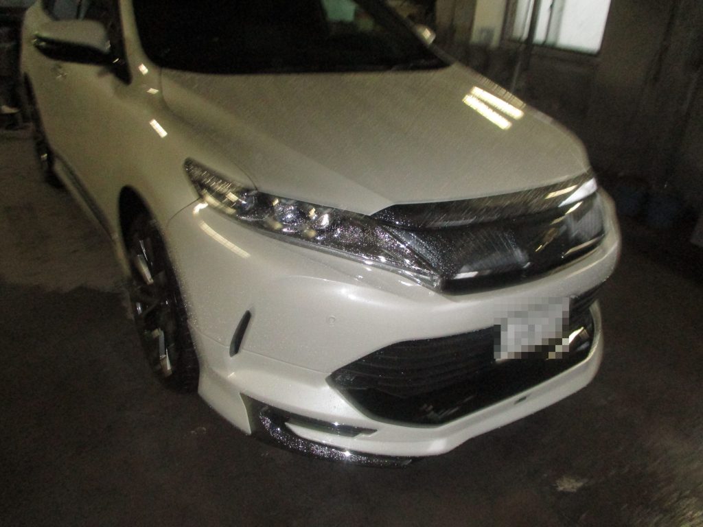 江南市のお客様からトヨタ・ハリアーのフロントスポイラーのキズ・変形の修理・塗装のご依頼いただきました。