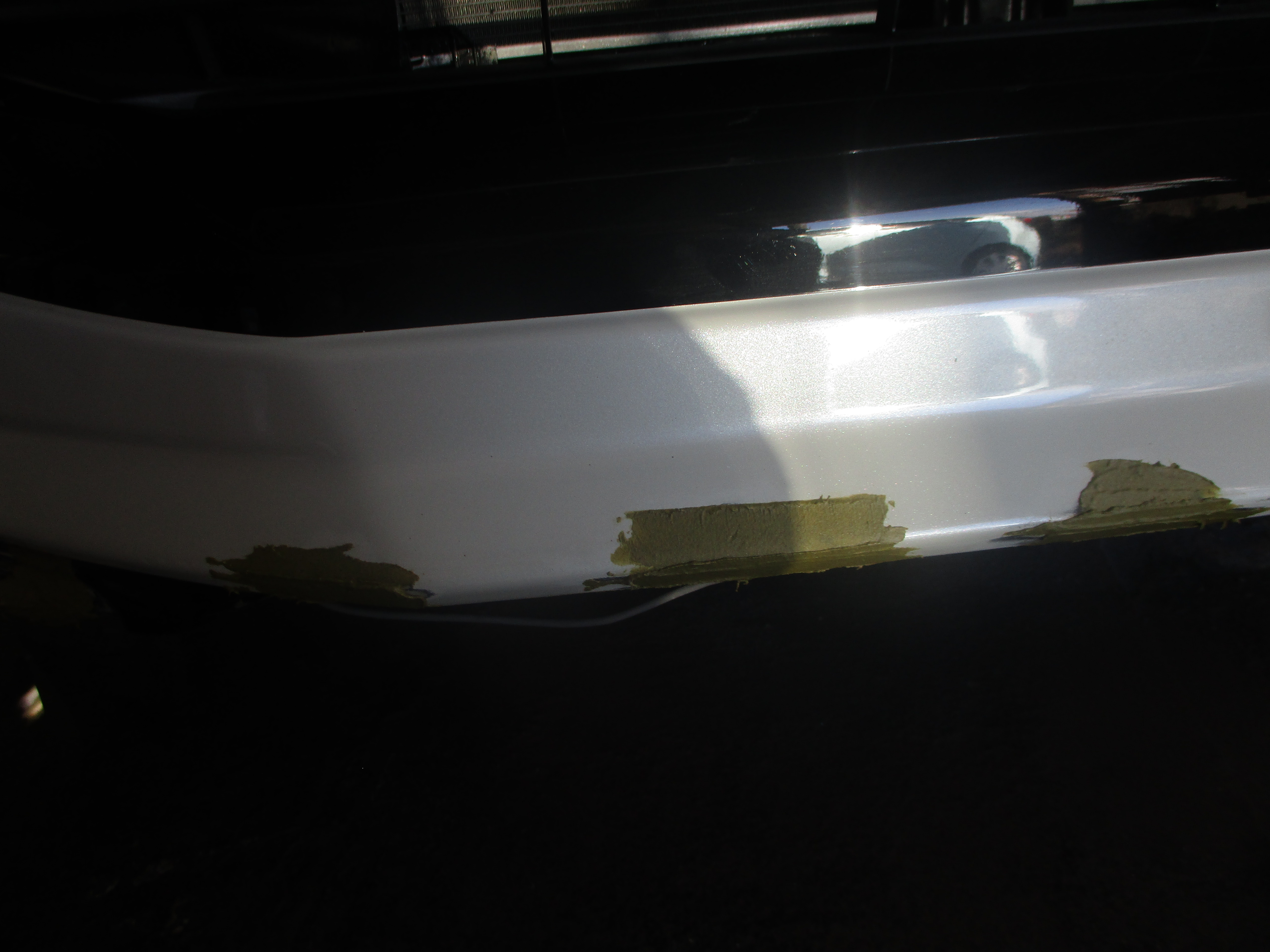 まずはスポイラーの切れと変形を先に補修しますので、下の取り付けの金具のステーを緩めてフリーにします。切れて離れてる箇所をヒートガンで熱を与えて修正します。そして離れないように電熱ピンで繋げて補修します。他にも2か所切れがありましたので同じように補修します。次にサンダーで表面を削り低めに削りパテを盛り研いでいき周辺と高さを合わせます。パテ研ぎが終わったら、最後にサフェーサーを吹き付けます。