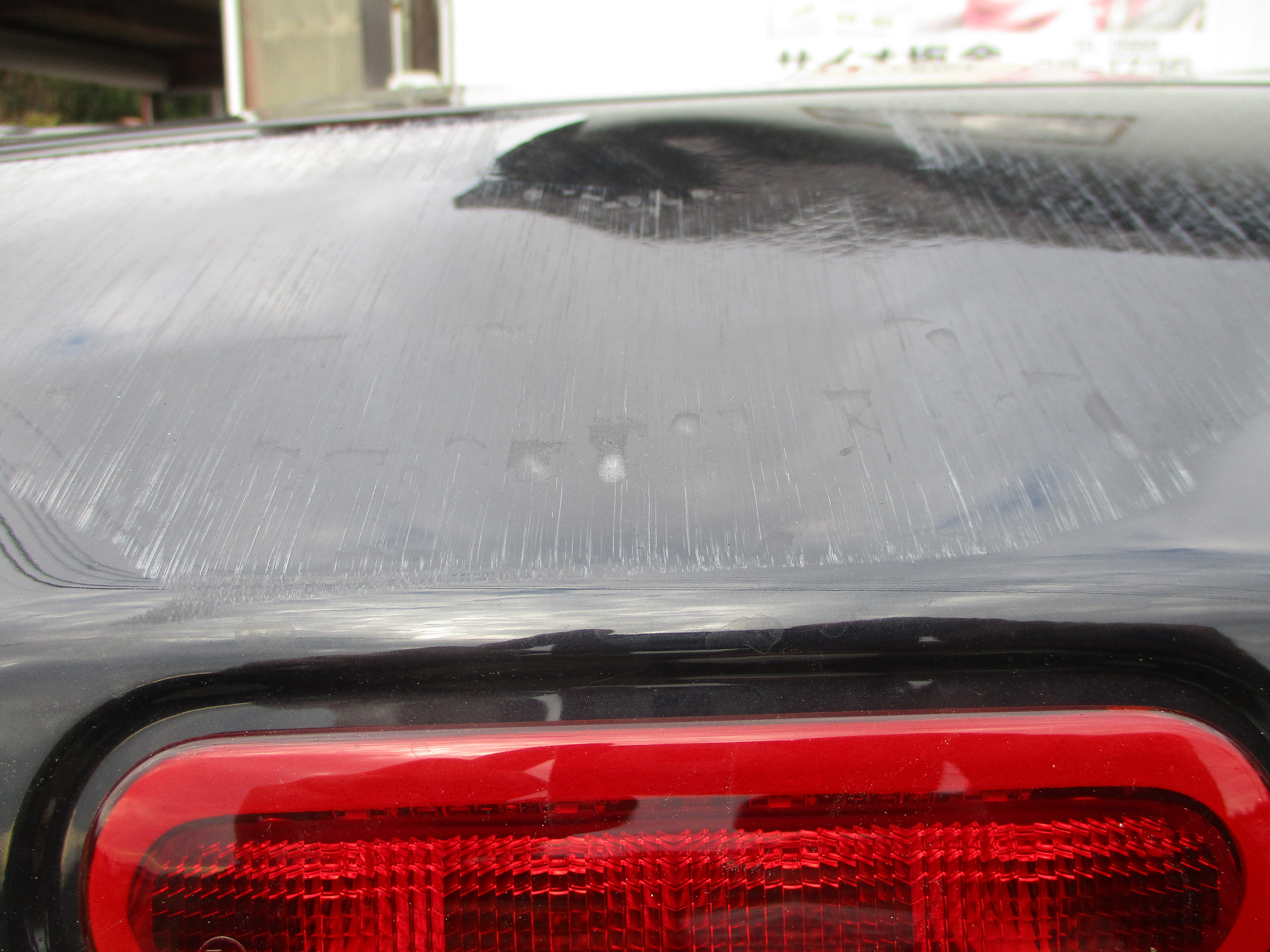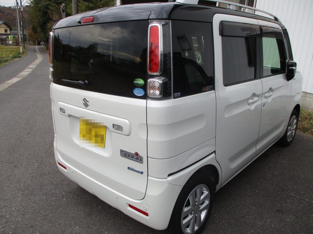 お客様からは下がってたシャッターに擦ってしまったようです。バックドアの上部が10センチ以上の擦り傷と少し凹みが入ってて目立ちます。付近にバックランプが付いてますが、邪魔になるので事前に外します。スペーシアの場合はツメで止まっている為、無理に外すと取り付け箇所が破損する恐れがありますので慎重に外してから板金作業をしていきます。
