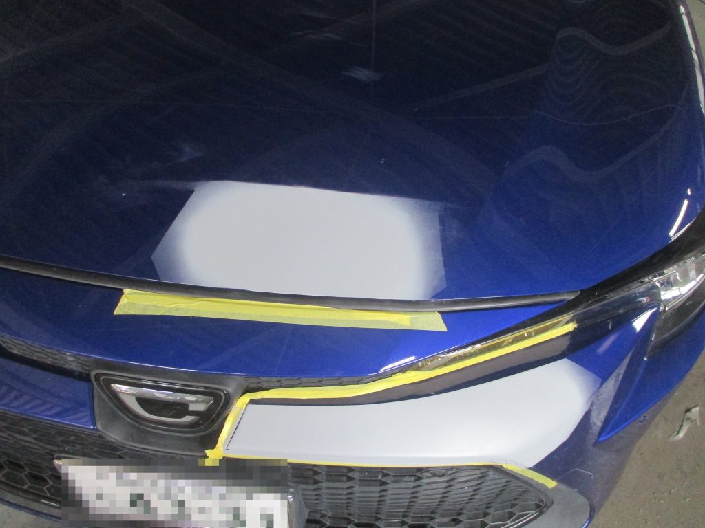 塗装の作業ですが、最初にカローラのカラー番号を確認して、配合を調べて調色して、出来上がった色を試しにボードに塗装して、車体の色味に細かく色合わせします。正確な色が出来たらボンネットとフロントバンパーを塗装します。