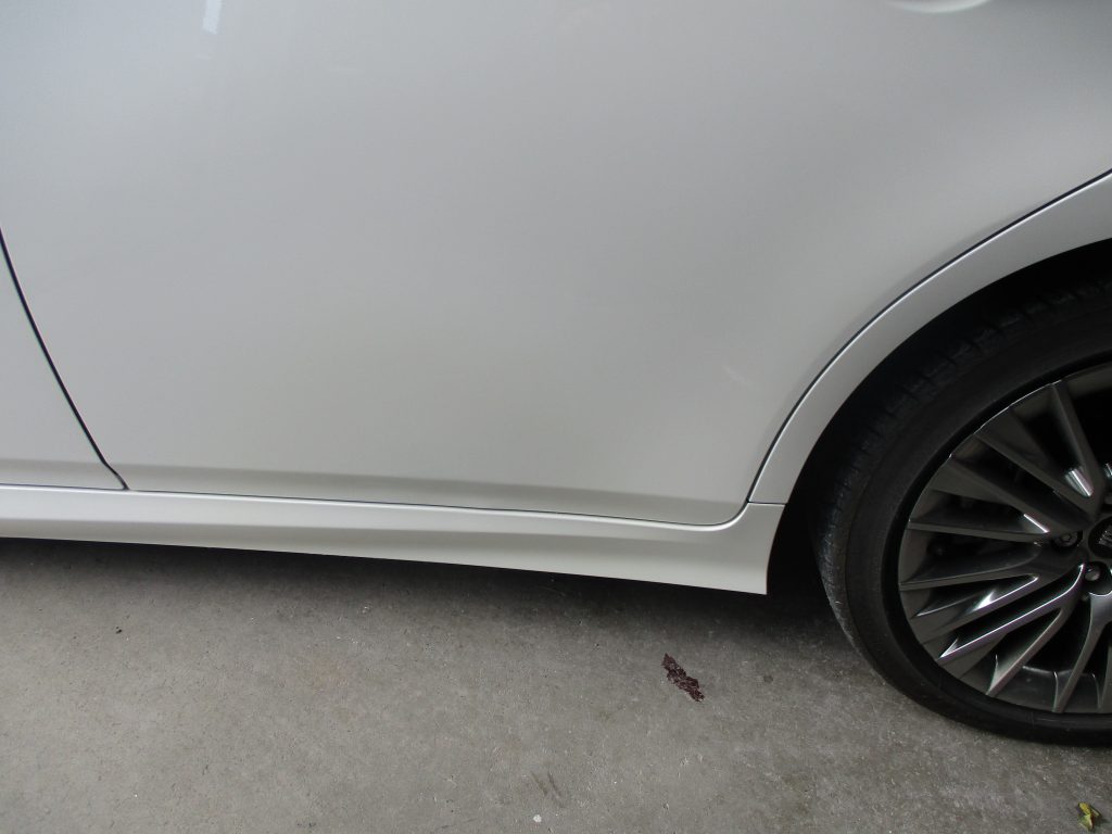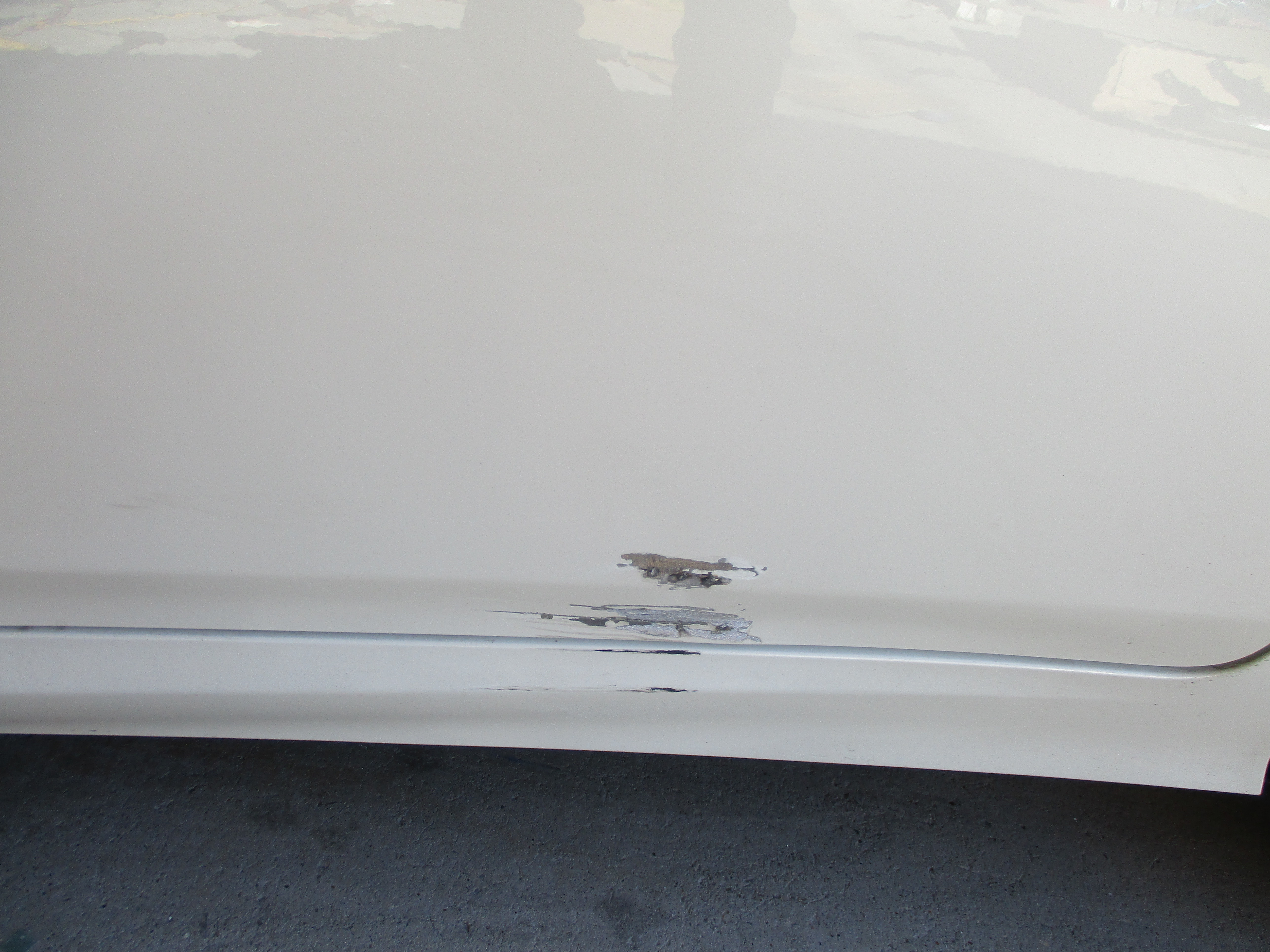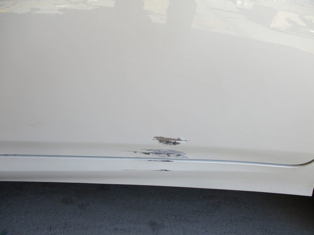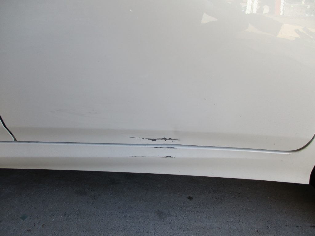 画像を見るとリアドアの下の端が凹んでて下地が見えてます。そのすぐ下のサイドスポイラーも削れて樹脂の素地が顔を出してます。