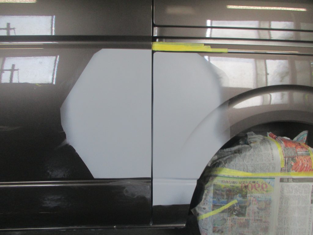 塗装は最初に色を作ります。車体のコーションラベルからカラー番号を確認して原色を何種類も混ぜていき、ベースの色が出来たら色合わせして何回も色を調合して確認します。養生したらスライドドアとリアクオータを塗装します。