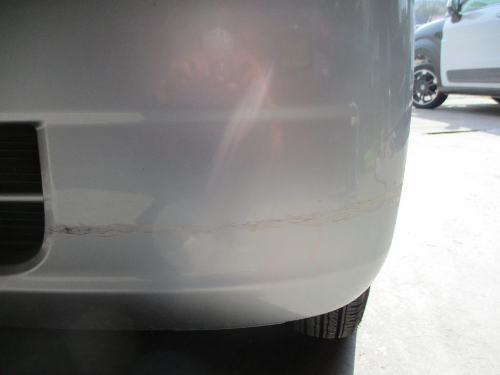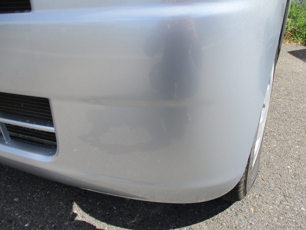 フロントバンパーの左の下の方に、計ってはいませんが30センチの横の一本キズが目立って見えますね。画像ではタッチアップが塗られてるので、キズ自体は確認できませんが、シンナーでラッカーシンナーで落としたところ、少し深いキズが出てきました。