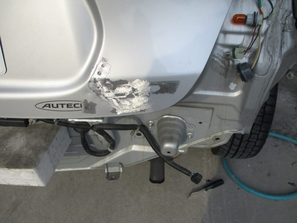 そしてヘコミの辺りにエンブレムが妨げになりますので剥がして、バックドアの右側からスタッド溶接機を使いワッシャーを溶接して、スライドハンマーでヘコミを深い部分から徐々に引き出していきます。右側が平らに引き出せたら、次に左側も板金して平らにしていきます。