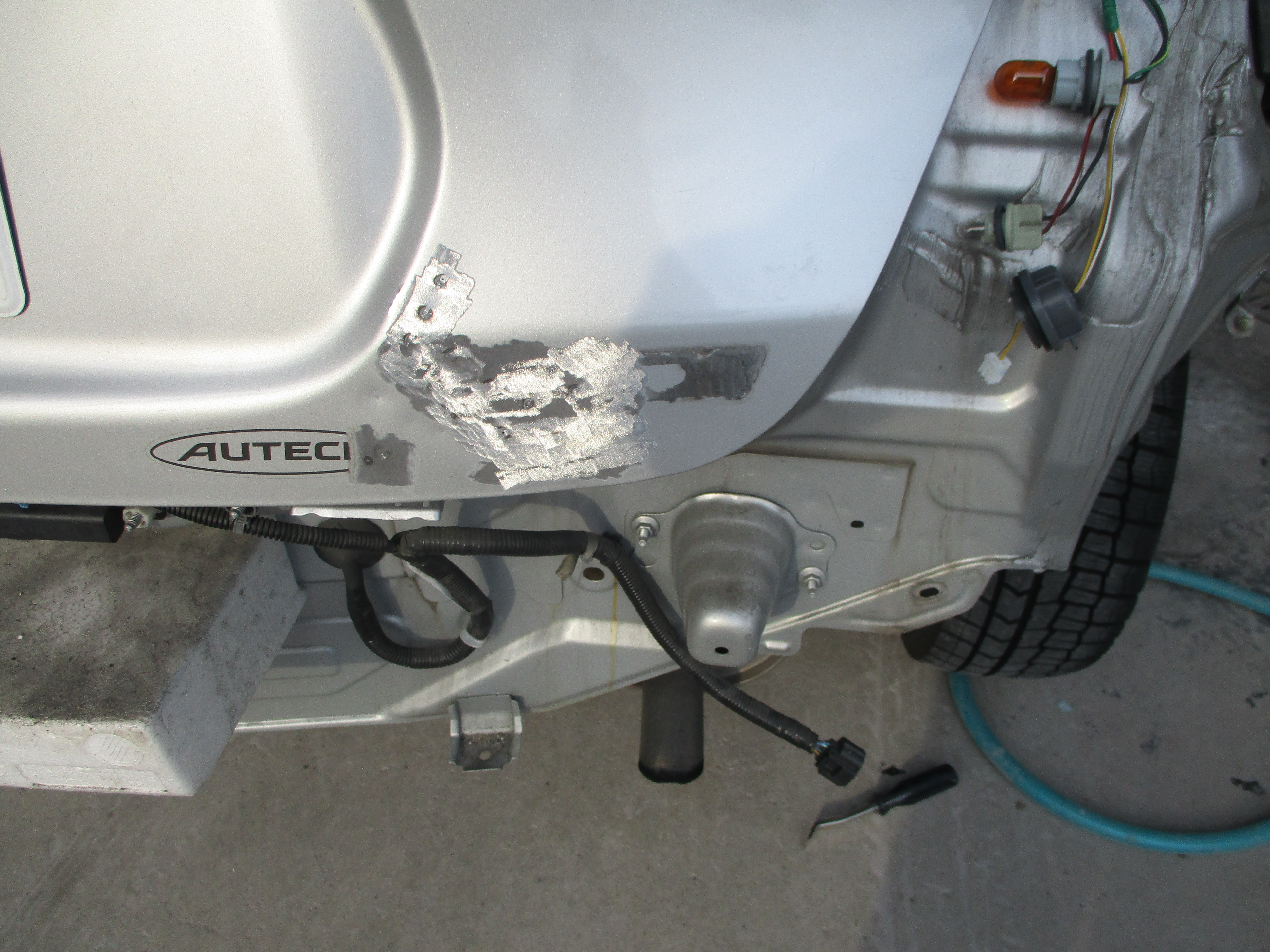 損傷は部品交換するほどの状態ではありませんので、バックドアは板金修理で直して、リアバンパーはボディーから外して修理します。お客様からはドア交換しなくて元に戻りますか?ご質問されましたが、このような損傷は何台も直してきてますので楽勝です(*^^)v