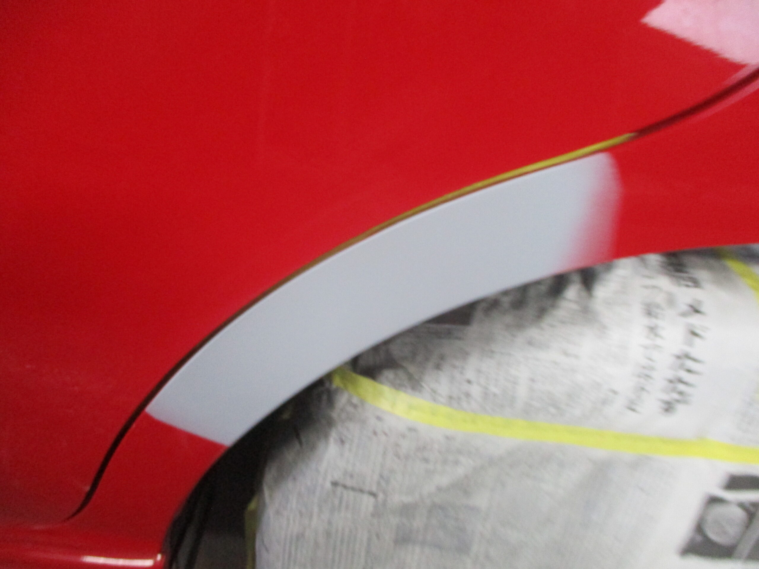 板金修理は最初に損傷箇所の塗装を機械で剥離して、ヘコミ部分を専用の引き出しハンマーで起こしていき粗出し修理します。引き出した部分にパテを塗りさらに形を作ってペーパーで120番ペーパーで整えます。最後にサフェーサーを塗装して乾かしてから表面をツルツルにして下地修理が終わりました。