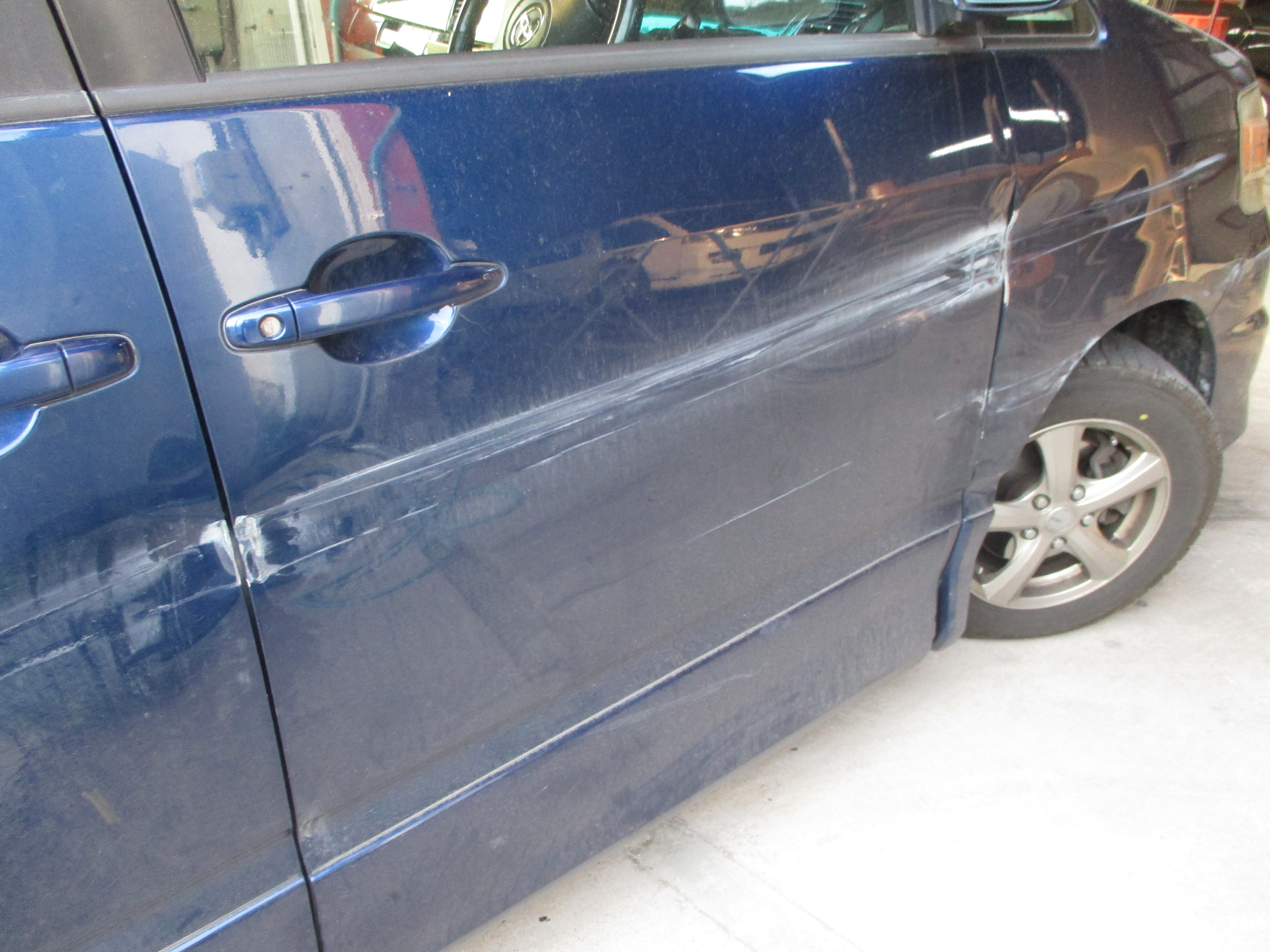 入り切らなくて画像には写っていませんが、フロントバンパーからリアクォータまで横に激しい損傷や擦りキズも含めて見られます。特にフロントドアとフェンダーは直せるのですか(・・?と驚かれるくらいです(笑)
