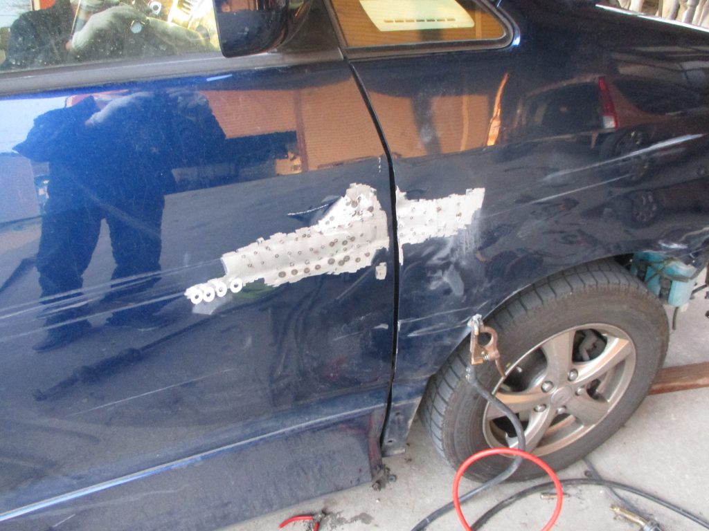 高さが出てきたら、外したフェンダーはそのまま裏返しヘコミを叩き出します。そしてフロントドアに合わせて、ある程度高さが揃ったら仮付けして終わりましたら他のパネルも順番に板金していきます。