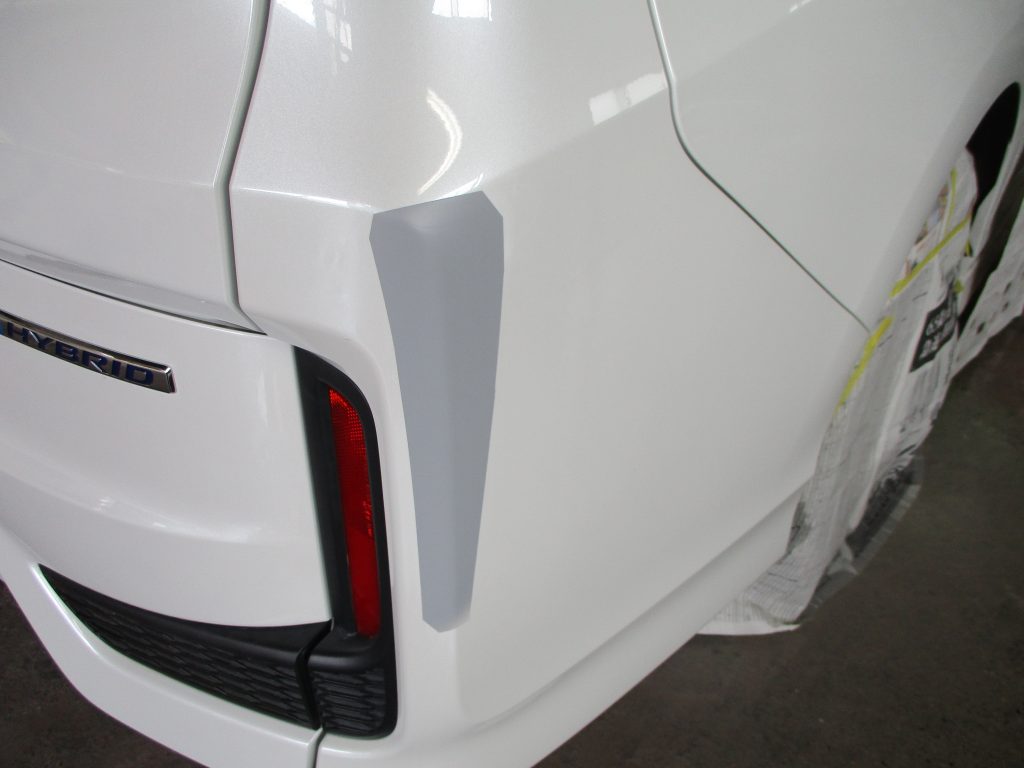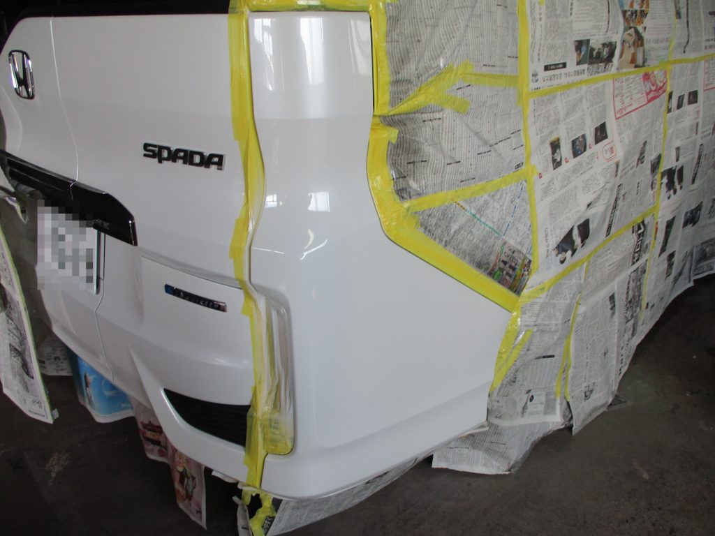 塗装は色を合わせるのに、ステップワゴンのオリジナルの塗料を調色していき何度も合わせて作ります。次に塗装のミストが周りに飛ばないようにマスキング(養生)してボディーをカバーします。ステップワゴンのリアバンパー構造が左右、真ん中と3分割でそれぞれ独立していたため、マスキングで上手く仕切れました。塗装の作業に移りますが、今回は3コートパールですので、最初にカラーベースを塗装して、パールベースでキラキラ感を付けて、それからクリヤー塗装で光沢を出していきます。